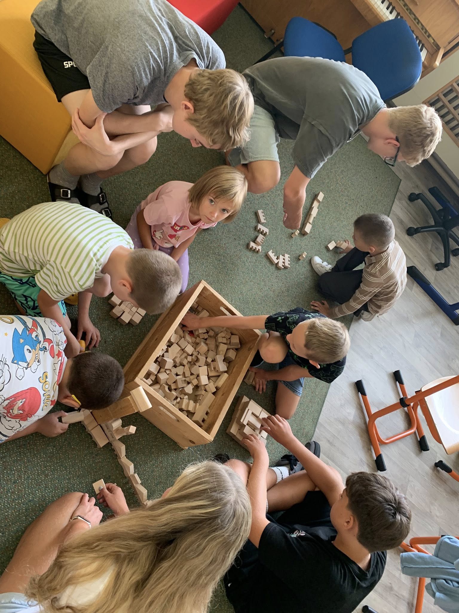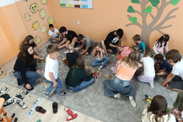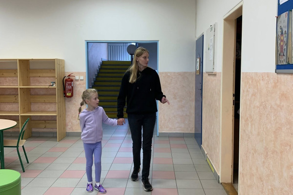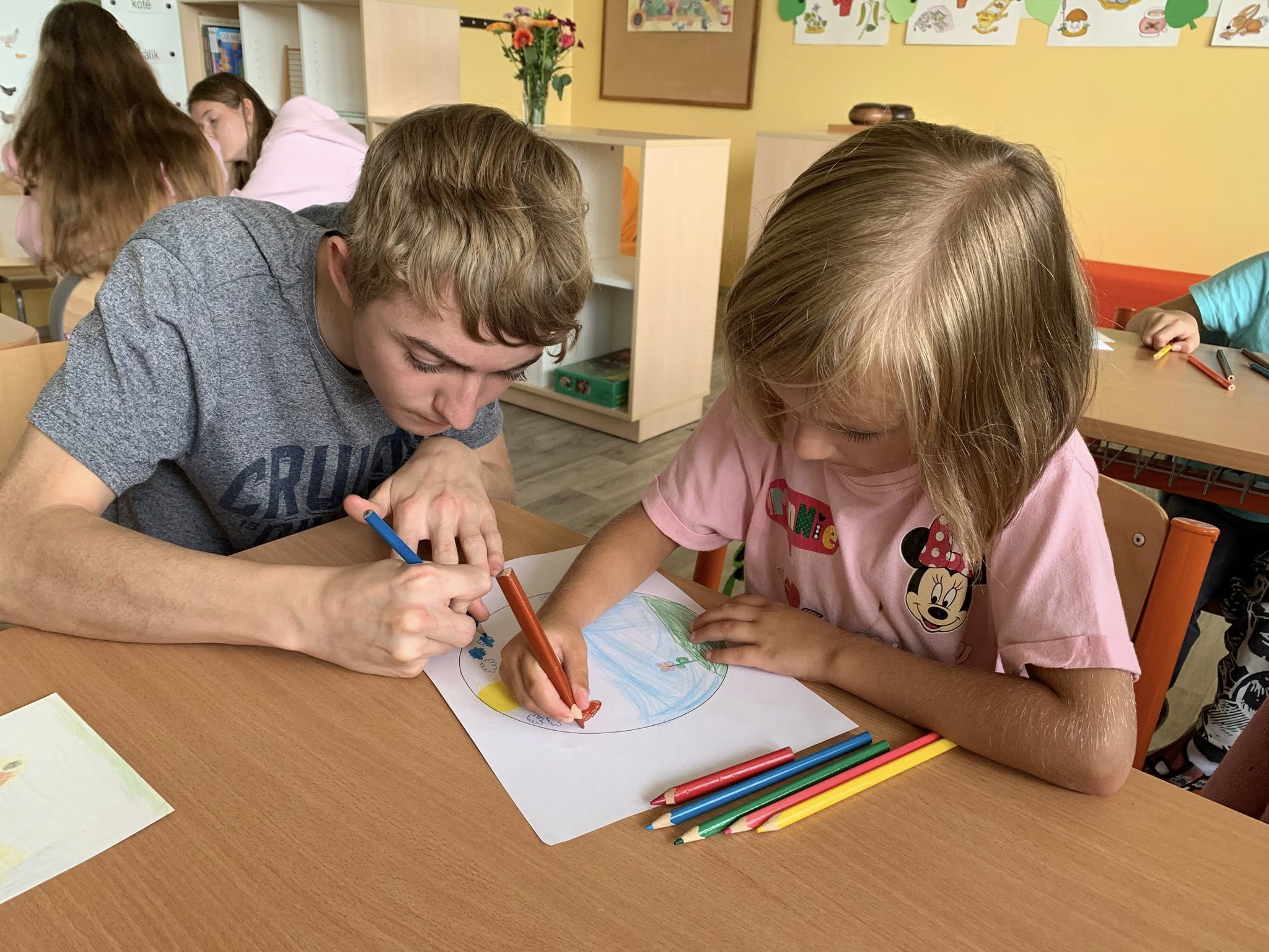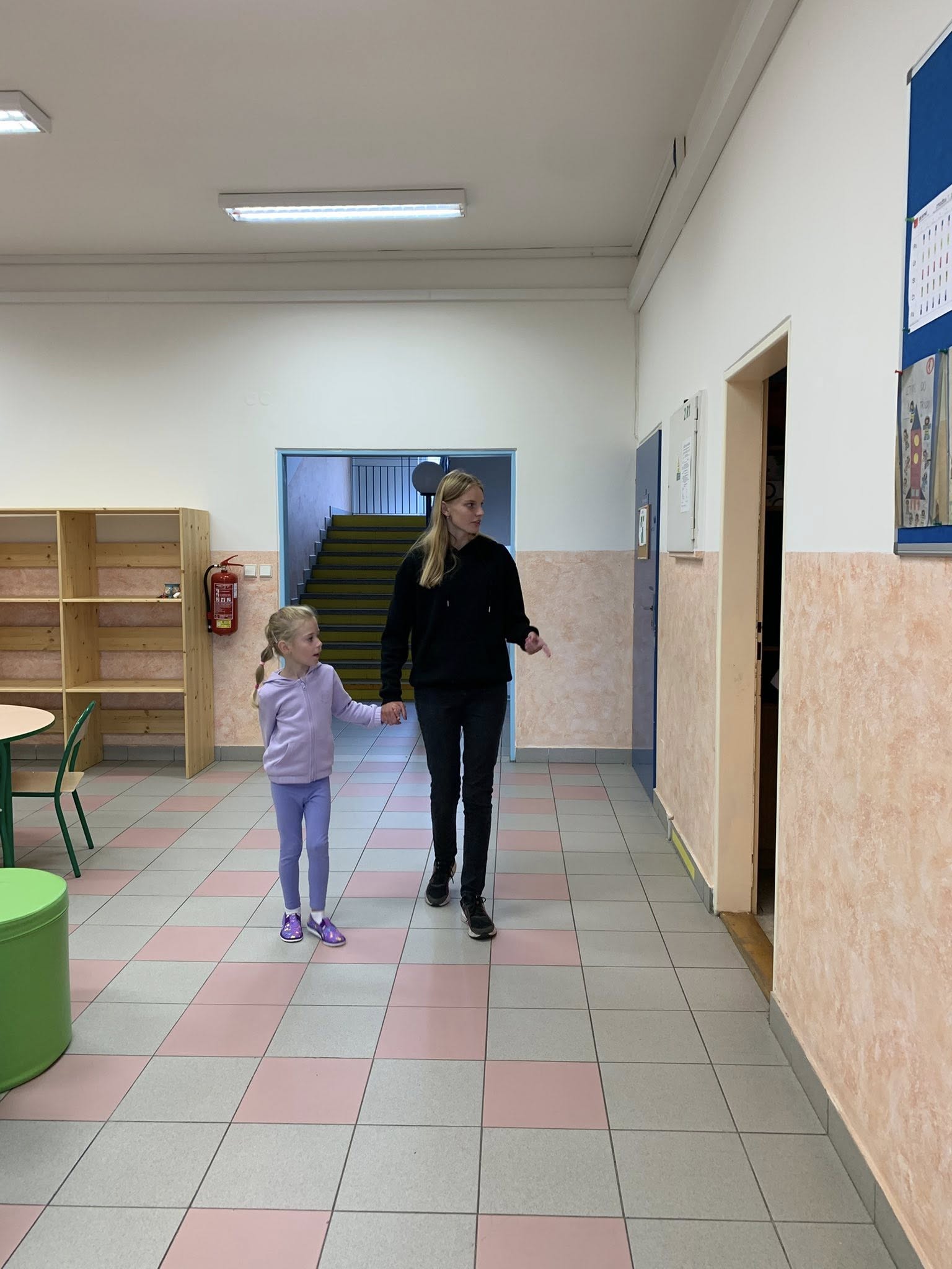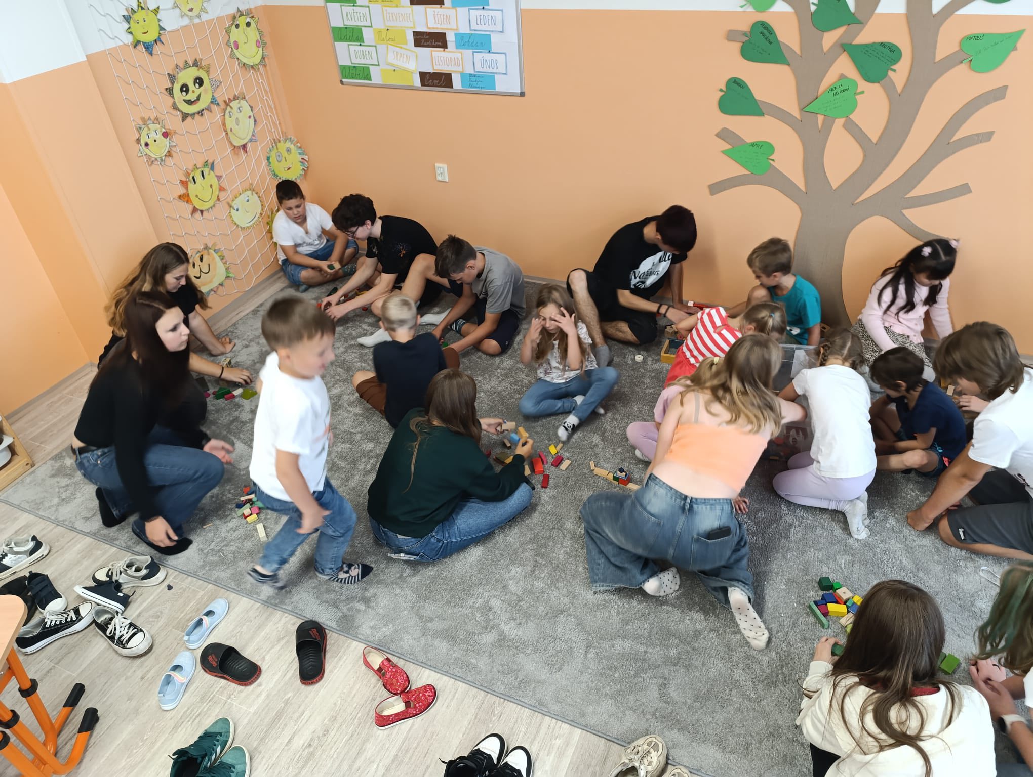 Už druhý den se na ně deváťáci přišli znovu podívat. Společně si nakreslili obrázek a deváťák provedl svého prvňáčka celou školou. Dokonce zavítali i do ředitelny, kde si popovídali s paní ředitelkou. Na chodbě si vyzkoušeli tabuli Amos nebo si zahráli fotbálek. V závěru si společně postavili stavbu z kostek. Bylo úžasné sledovat, jak jsou deváťáci ke svým prvňáčkům ohleduplní, pozorní a přijímající.