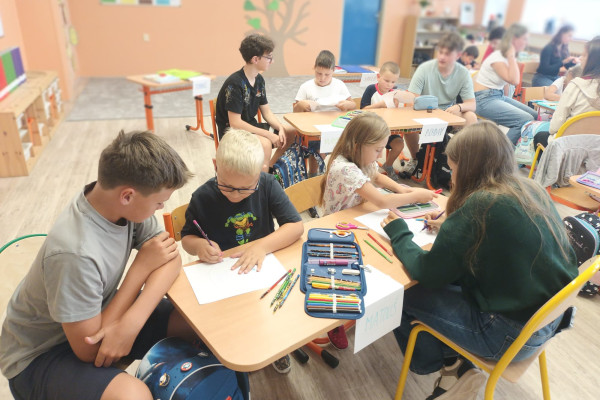 V následujících dnech navštívili žáci prvních tříd své patrony v jejich třídě. Poseděli u nich v křesílkách a prohlédli si jejich výkresy. Zkrátka – jsou tu ve škole jeden pro druhého, znají se, zdraví se, navštěvují se a už teď plánují další setkání – tentokrát procházku po zoologické zahradě.