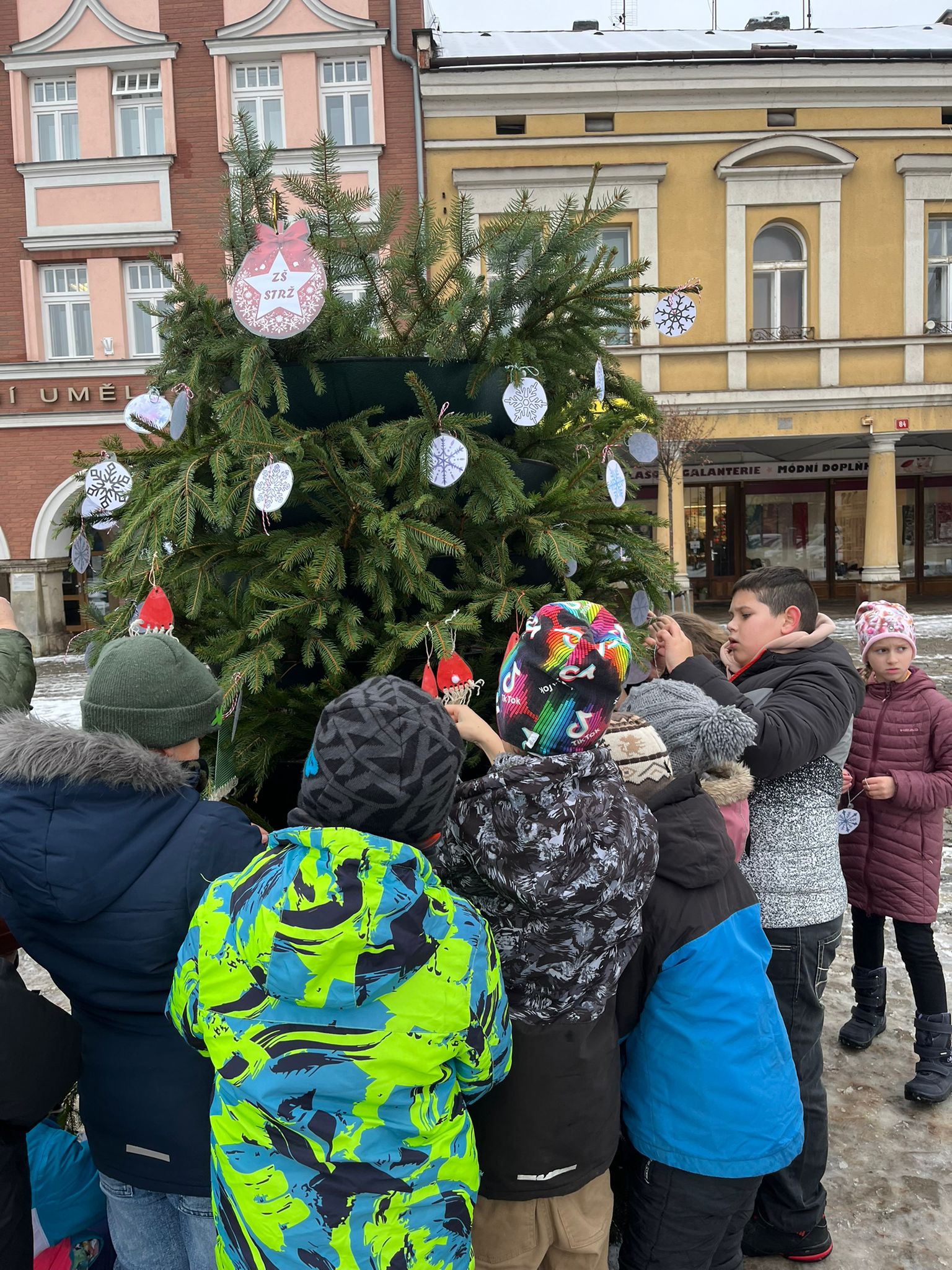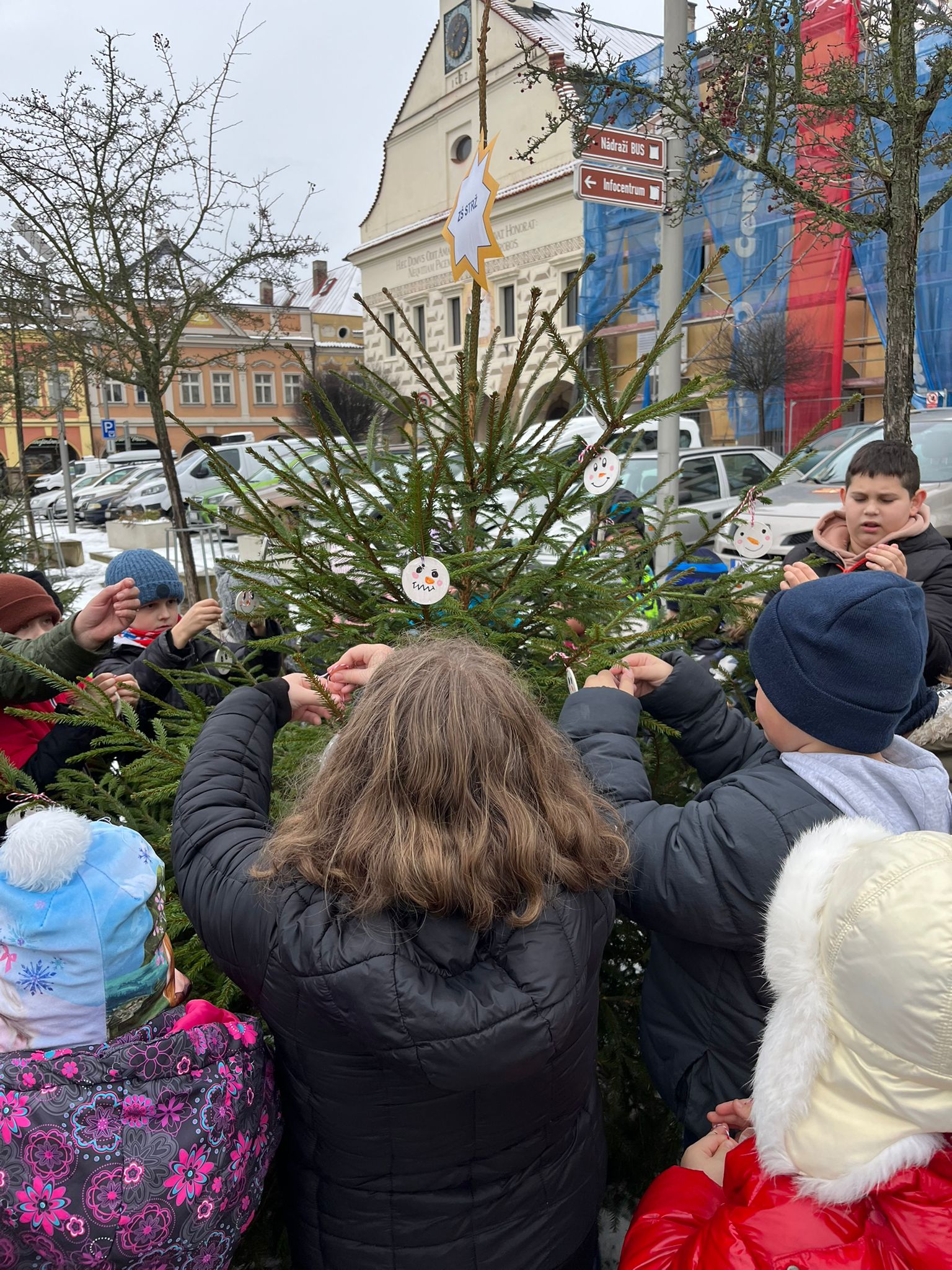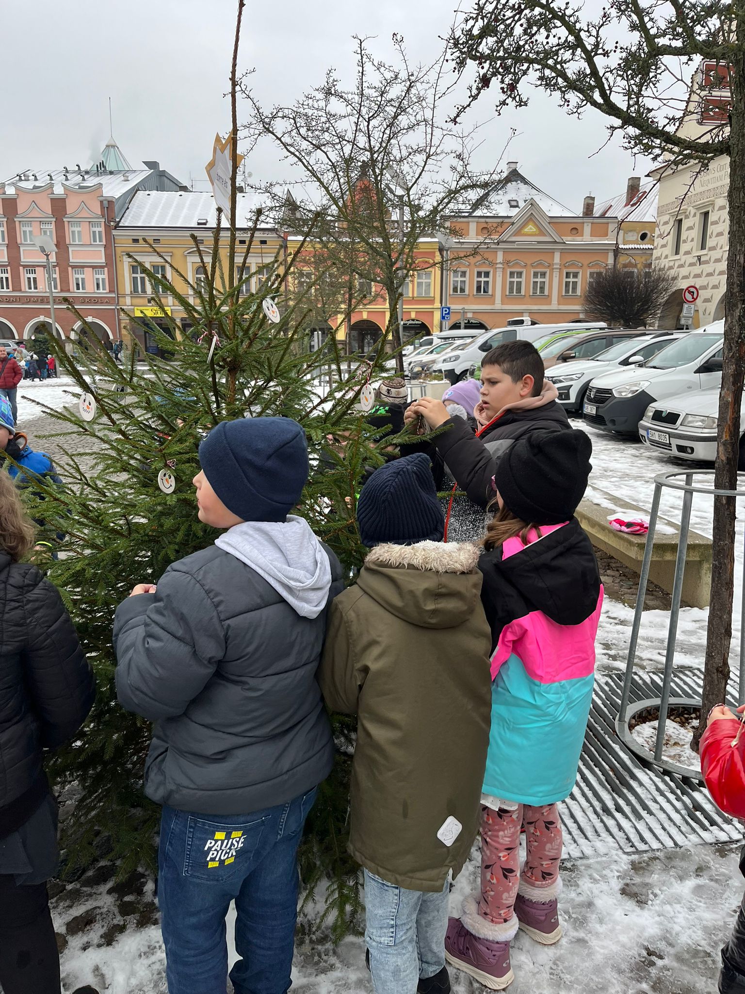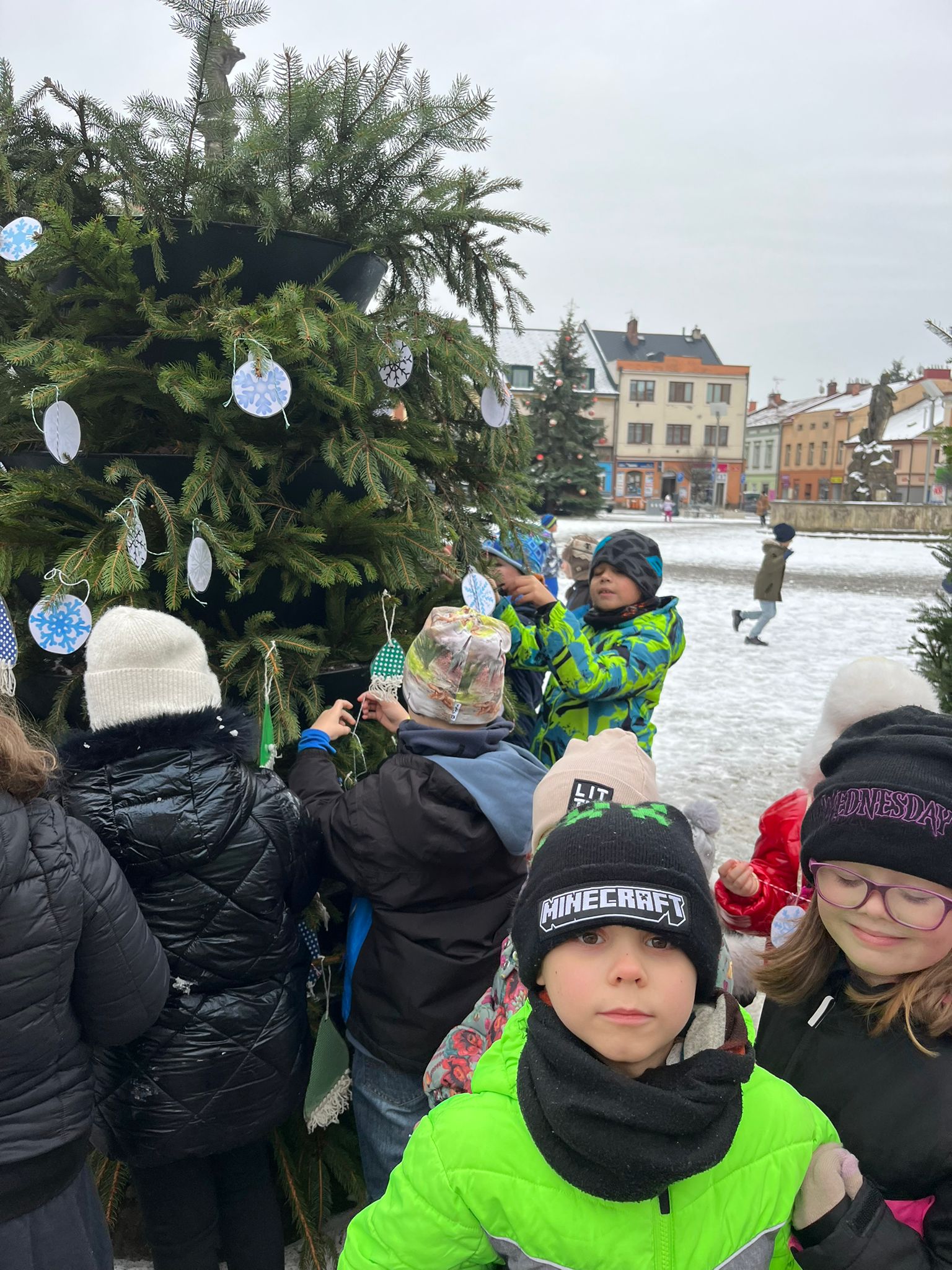 Již tradičně zdobí děti z naší školní družiny vánoční stromeček na náměstí. Letos jsme si tuto milou povinnost rozdělili mezi mladší a starší děti. Mladší děti z předškolní třídy vyrobily pozoruhodné řetězy z chlupatých kuliček a starší děti z 1. – 5. ročníku, kteří si s výrobou také daly velkou práci, připravily krásné sněhuláčky na dřevěném kolečku. V úterý 26.11. po obědě vše děti z 1.- 4. ročníku přinesly na náměstí a vyzdobily jimi vánoční stromeček. Letos k vánočnímu stromečku přibylo ještě zdobení věže, kam děti pověsily vločky, trpaslíky a perníčky. Jak se jim to povedlo posuďte sami. Celá akce se vydařila a kouzlo Vánoc bylo tu