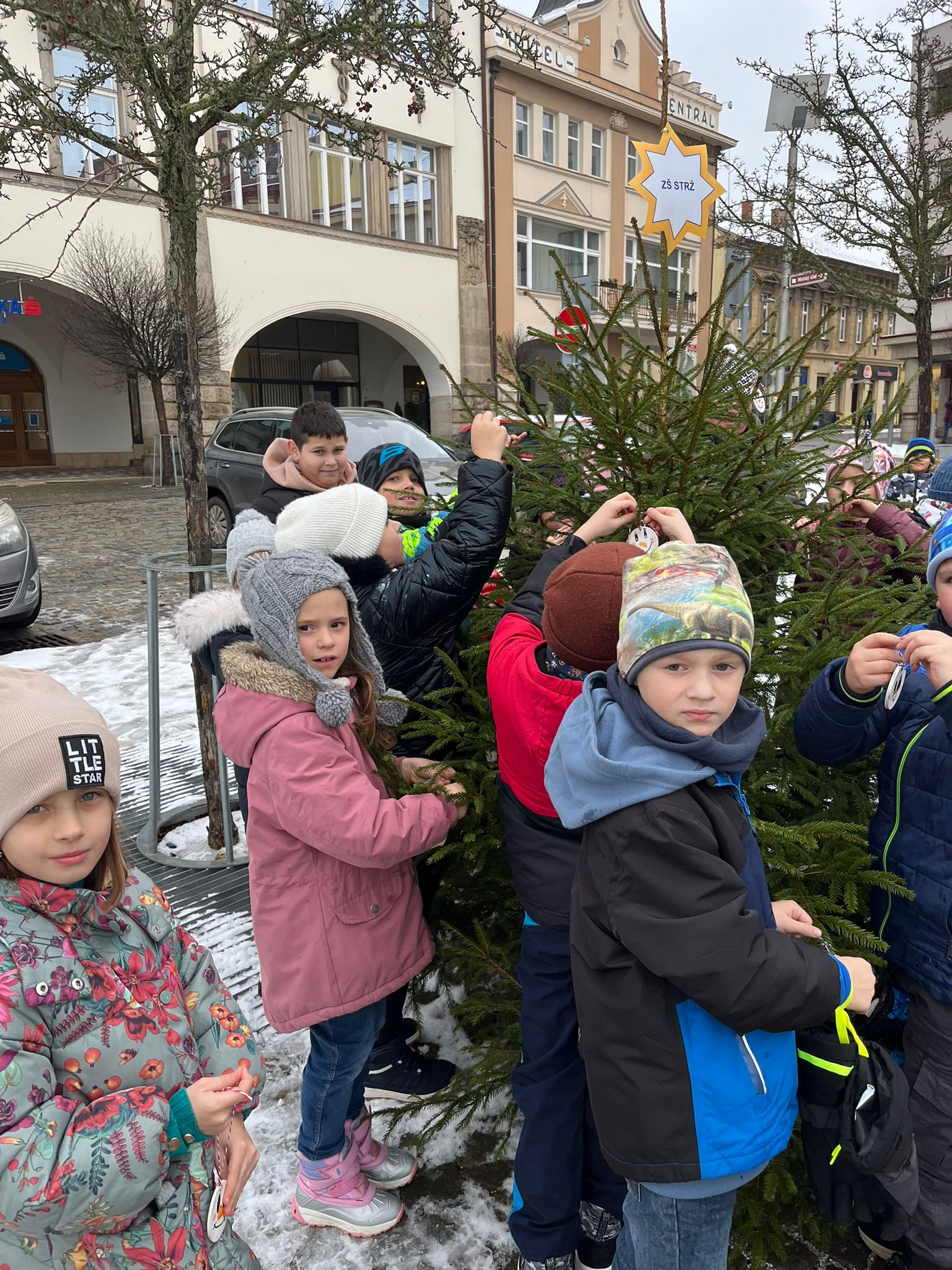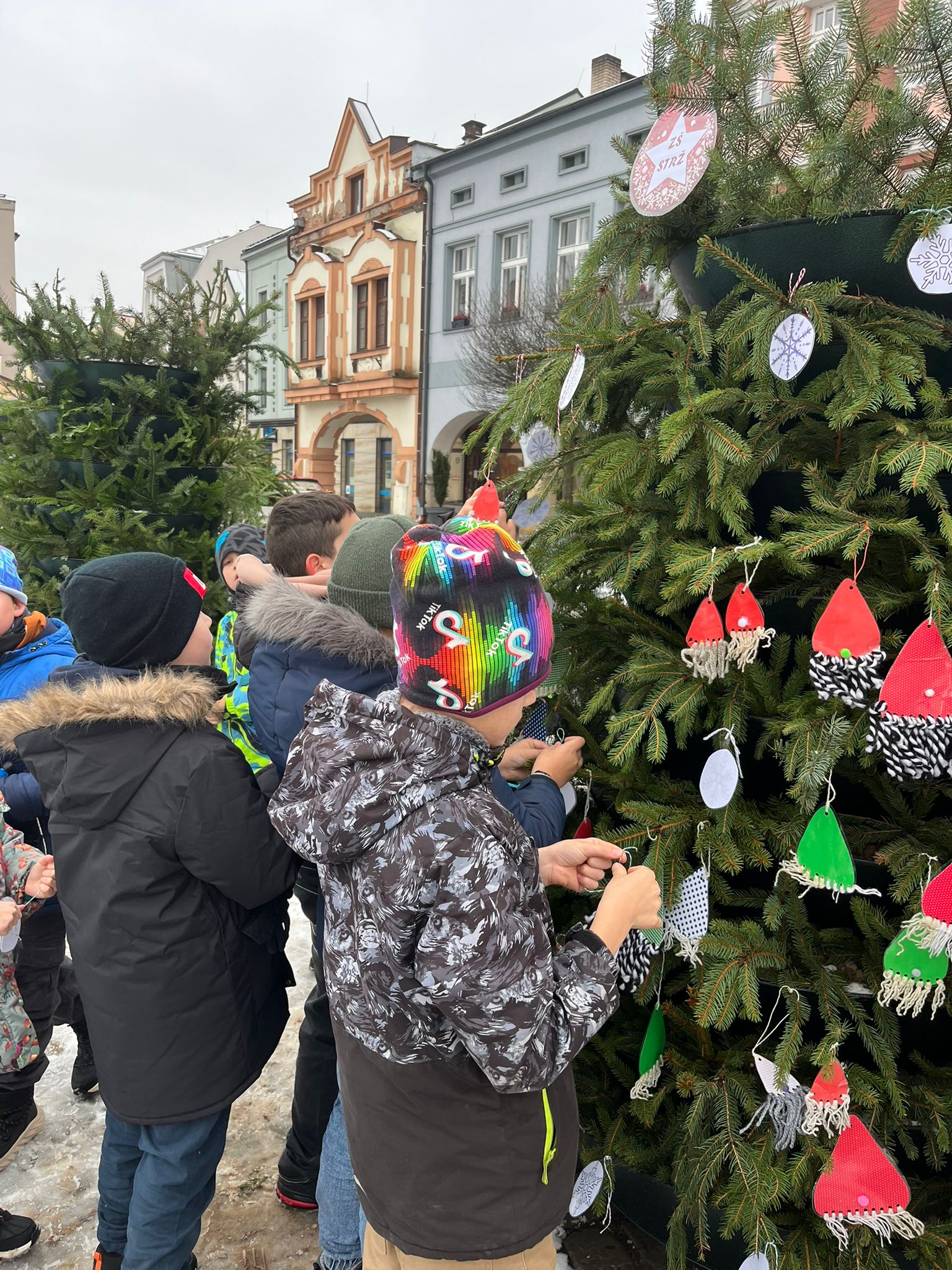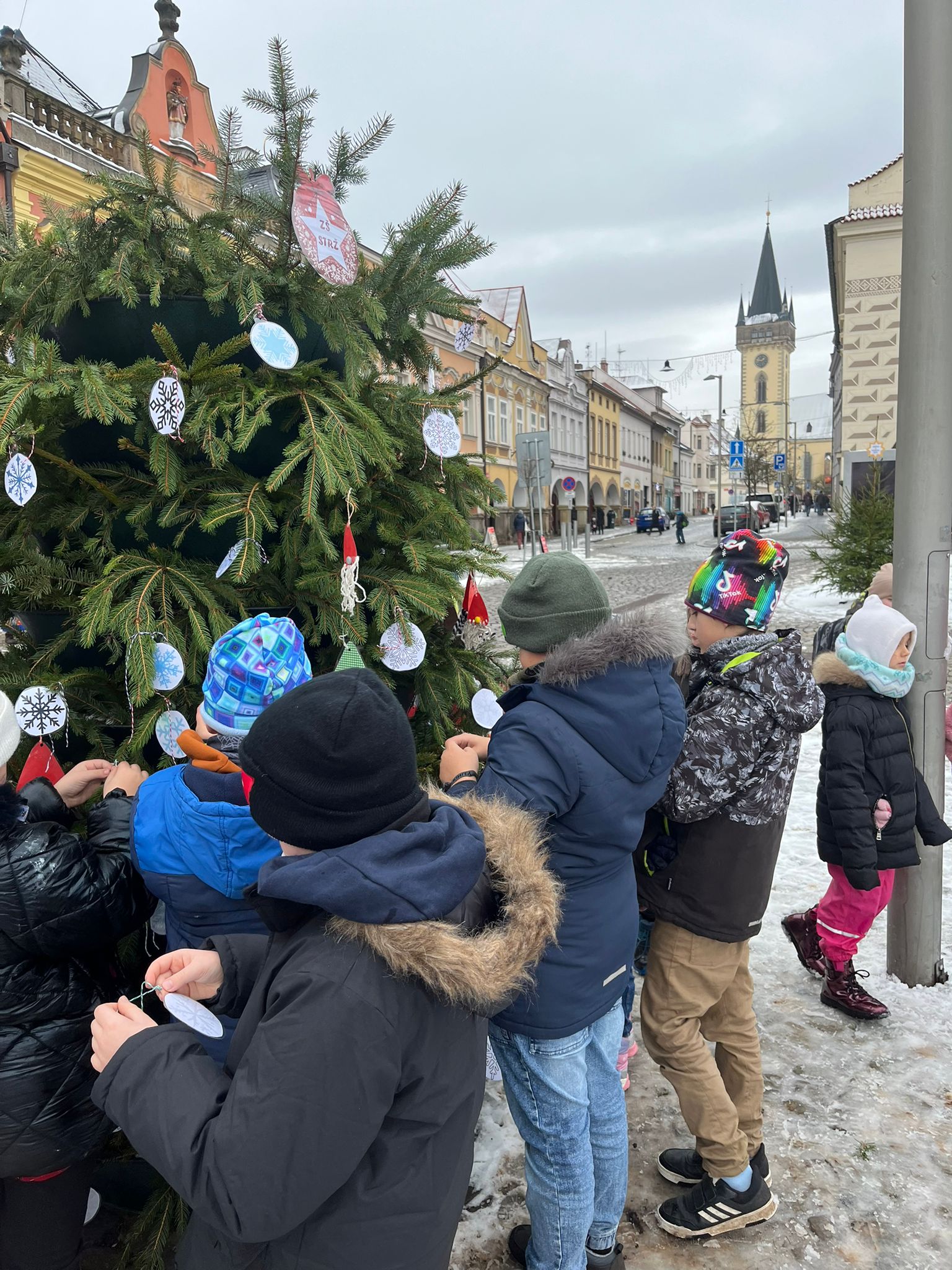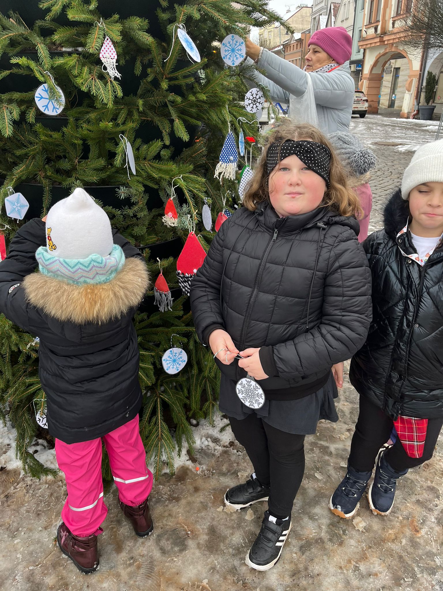 Již tradičně zdobí děti z naší školní družiny vánoční stromeček na náměstí. Letos jsme si tuto milou povinnost rozdělili mezi mladší a starší děti. Mladší děti z předškolní třídy vyrobily pozoruhodné řetězy z chlupatých kuliček a starší děti z 1. – 5. ročníku, kteří si s výrobou také daly velkou práci, připravily krásné sněhuláčky na dřevěném kolečku. V úterý 26.11. po obědě vše děti z 1.- 4. ročníku přinesly na náměstí a vyzdobily jimi vánoční stromeček. Letos k vánočnímu stromečku přibylo ještě zdobení věže, kam děti pověsily vločky, trpaslíky a perníčky. Jak se jim to povedlo posuďte sami. Celá akce se vydařila a kouzlo Vánoc bylo tu