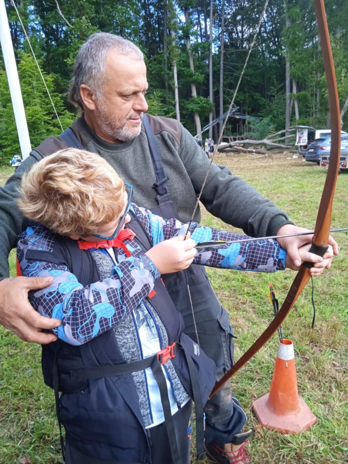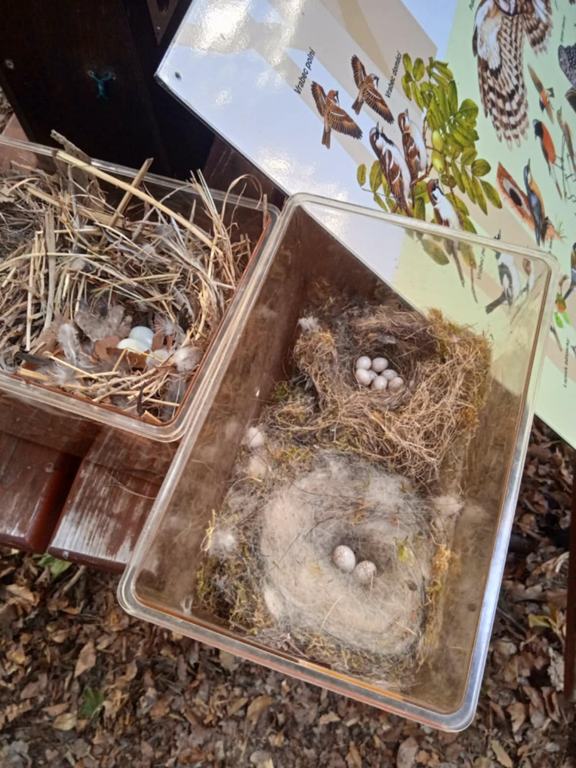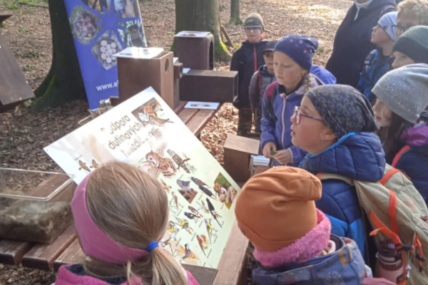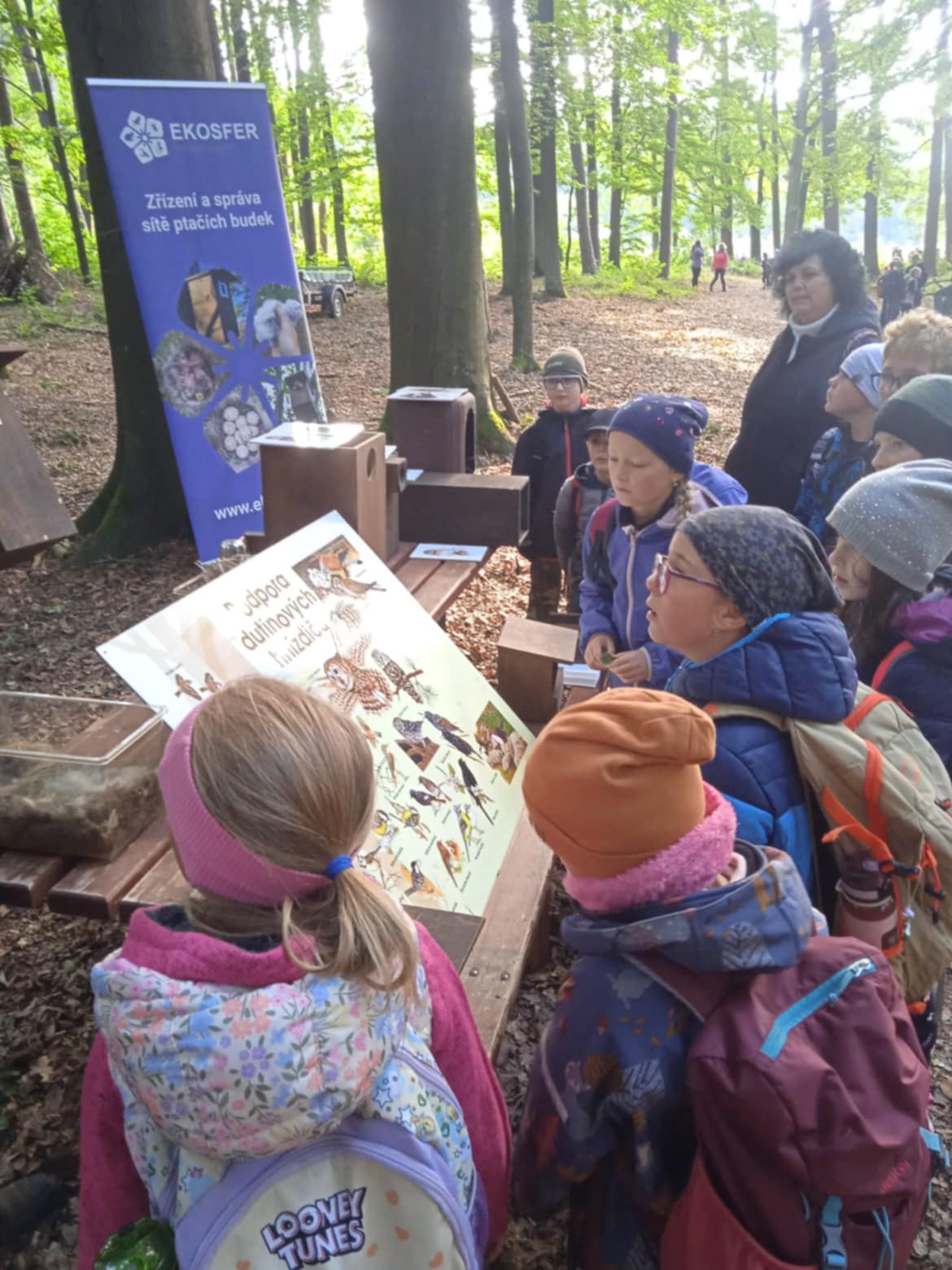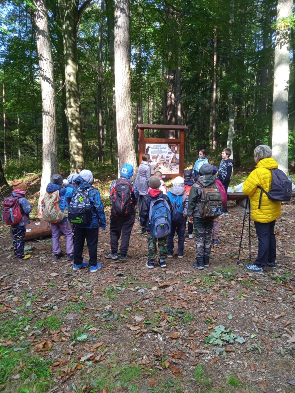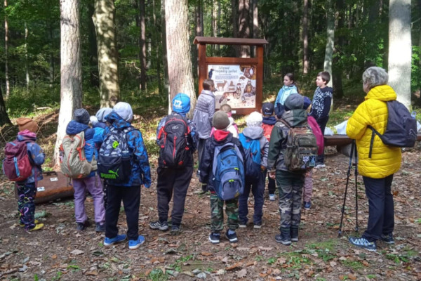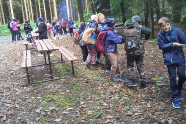 2. října jsme využili pozvání do dvorského lesa. Zopakovali jsme si, co už jsme znali a byli jsme velmi chváleni. Poznáme stopy zvířat, stromy a keře, umíme pojmenovat jejich plody. Vyzkoušeli jsme si, jak na tom jsme ve skoku do dálky v porovnání s lesními zvířaty. Nic moc, něco mezi kobylkou a žabkou. Pokusili jsme se odtáhnout kládu na řetězu – to se nám spolu s páťáky povedlo, proti navijáku za traktorem jsme ale neměli vůbec šanci. Dozvěděli jsme se, jak žije spousta havětě, která není vidět, a jak je pro les potřebná. Prohlídli jsme si taky ptačí hnízda i s vajíčky. Není vůbec těžké je od sebe rozeznat, každé je úplně jiné a z jiného materiálu. Jen vědět, komu patří! Pohladili jsme si tažného koně a dozvěděli se, jak v lese pracuje a jak je nenahraditelný. Už víme, co znamenají ta čísla na kládách a zkusili jsme si je tam palicí natisknout – skoro vůbec nám to nešlo, ještě že už se dají použít fixy. Tělo jsme protáhli na lesní prolézačce, vyfotili se s dravci a taky si zastříleli z luku. Místo oběda ve školní jídelně byl vlastnoručně opečený buřt. A jako dárek na památku jsme si koupili pravý lesní med.
